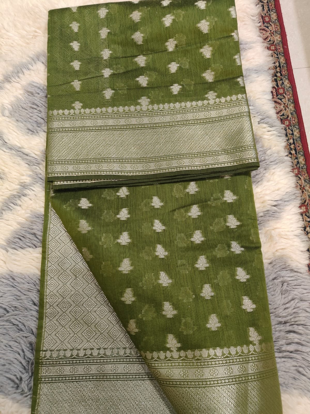 Be the first to review “Mehdi colour banarasi silk saree with silver zari weaving.”