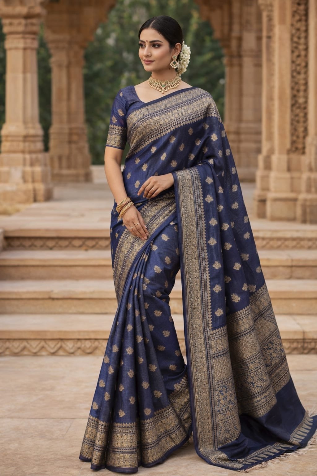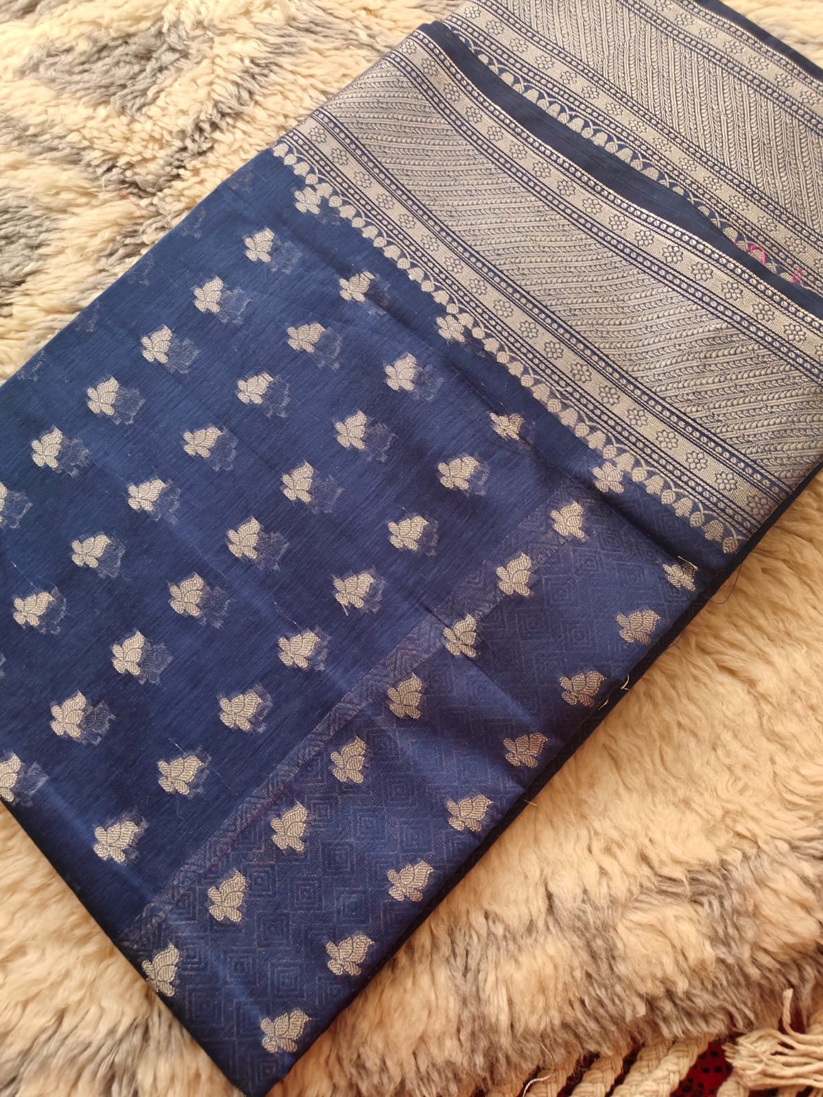 A Banarasi silk saree with a classic booti jal pattern showcases timeless elegance and rich craftsmanship. The delicate all-over woven motifs create a graceful and luxurious look. Made from fine silk fabric, it offers a smooth drape and traditional charm, making it perfect for weddings, festive occasions, and cultural celebrations. ✨