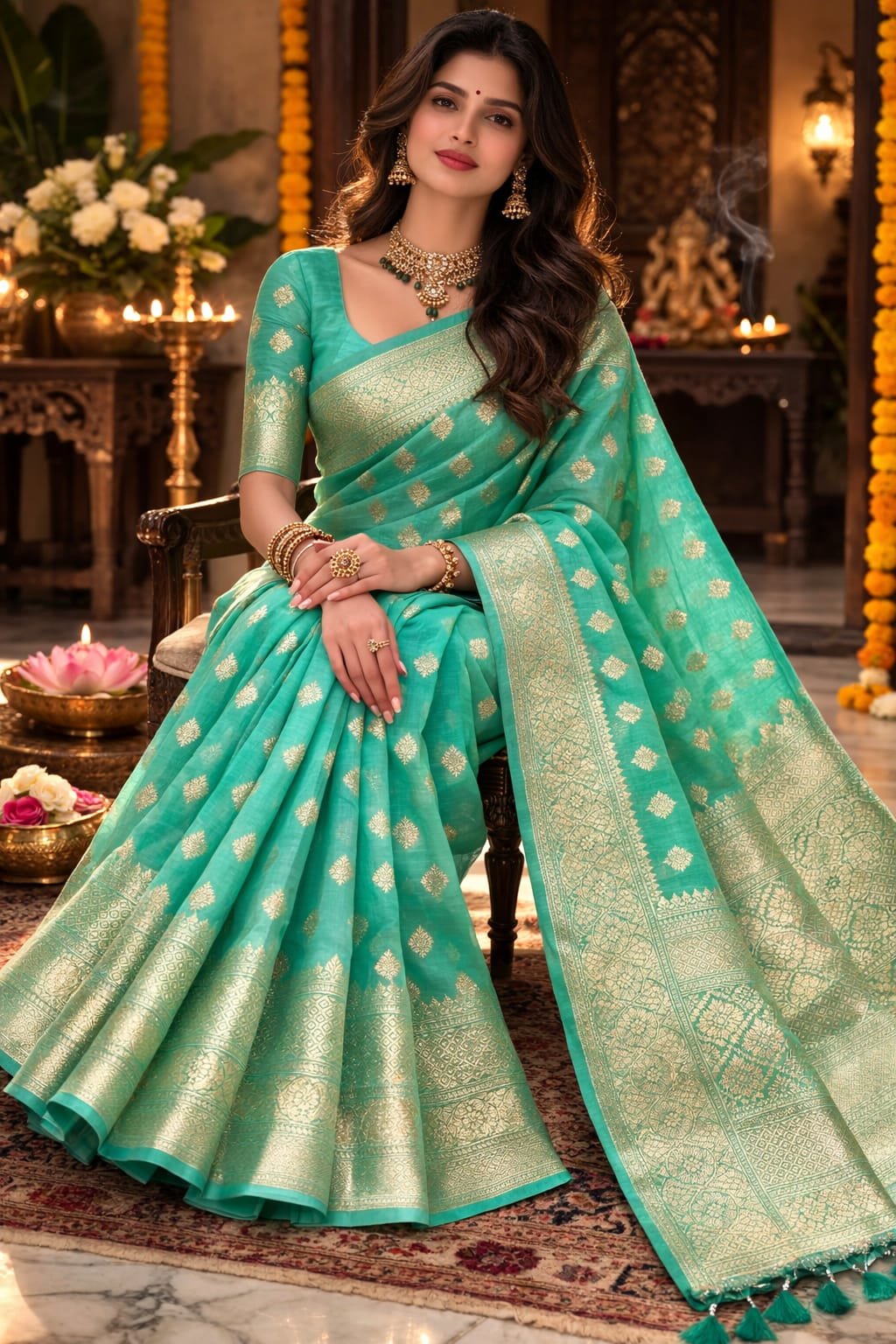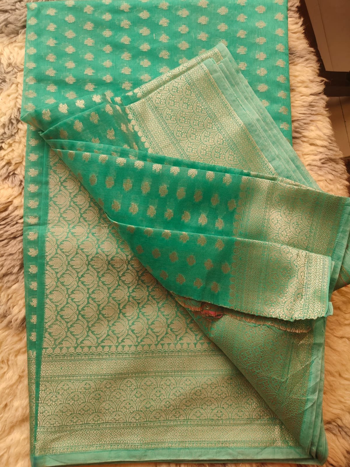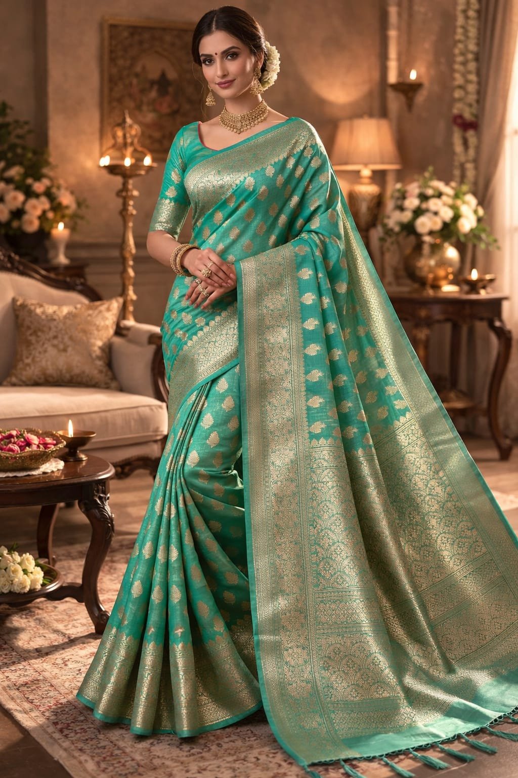 A Banarasi silk saree with a classic booti jal pattern showcases timeless elegance and rich craftsmanship. The delicate all-over woven motifs create a graceful and luxurious look. Made from fine silk fabric, it offers a smooth drape and traditional charm, making it perfect for weddings, festive occasions, and cultural celebrations. ✨