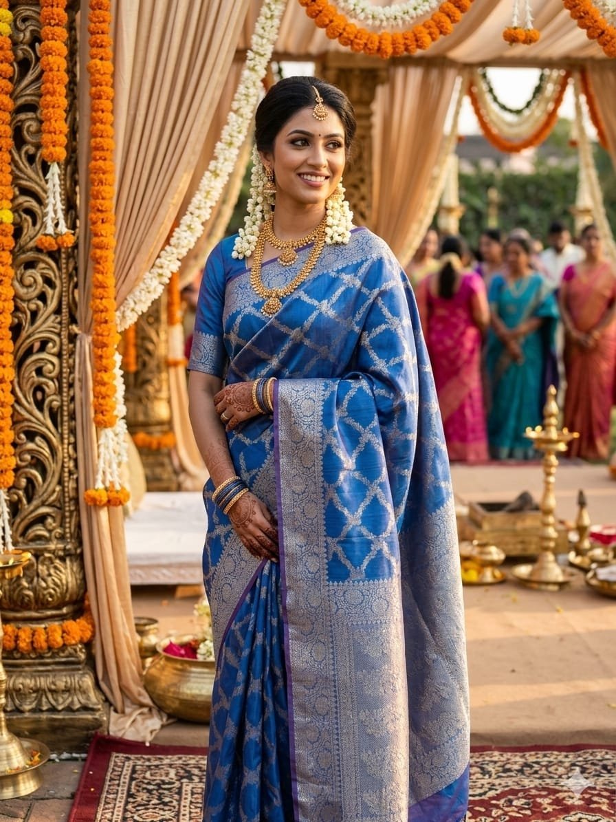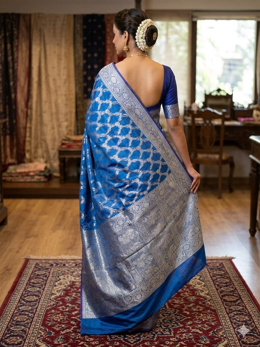 A Banarasi silk saree with a classic booti jal pattern showcases timeless elegance and rich craftsmanship. The delicate all-over woven motifs create a graceful and luxurious look. Made from fine silk fabric, it offers a smooth drape and traditional charm, making it perfect for weddings, festive occasions, and cultural celebrations. ✨