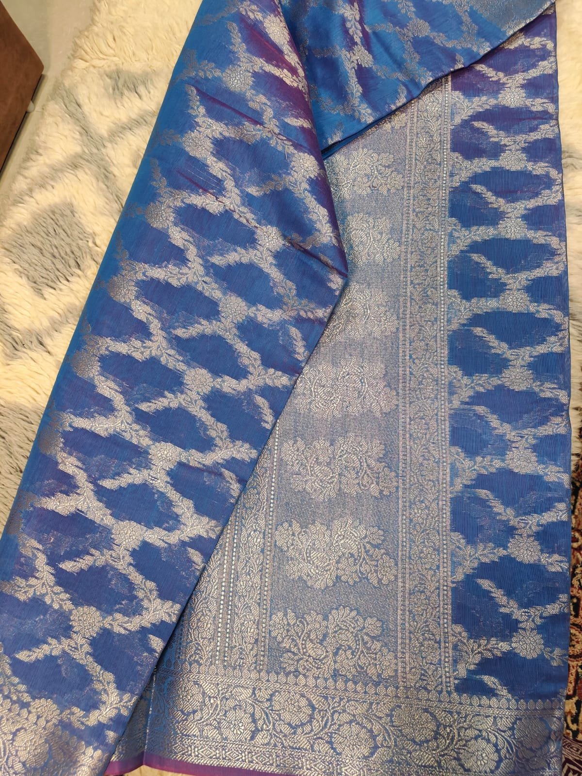 Perfect for summer functions. A Banarasi silk saree with a classic booti jal pattern showcases timeless elegance and rich craftsmanship. The delicate all-over woven motifs create a graceful and luxurious look. Made from fine silk fabric, it offers a smooth drape and traditional charm, making it perfect for weddings, festive occasions, and cultural celebrations. ✨