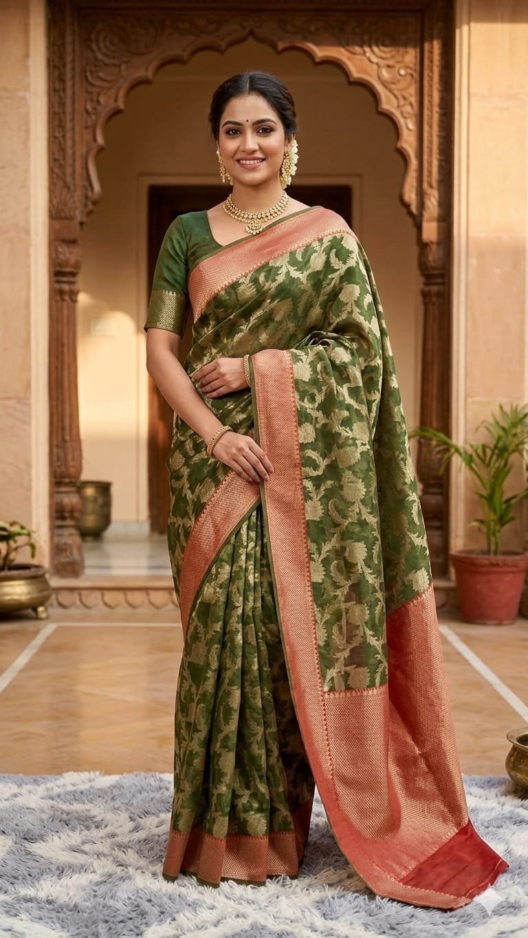 Perfect queen saree Banarasi looms present the most luxurious saree. Perfect for summer functions. A Banarasi silk saree with a classic booti jal pattern showcases timeless elegance and rich craftsmanship. The delicate all-over woven motifs create a graceful and luxurious look. Made from fine silk fabric, it offers a smooth drape and traditional charm, making it perfect for weddings, festive occasions, and cultural celebrations. ✨