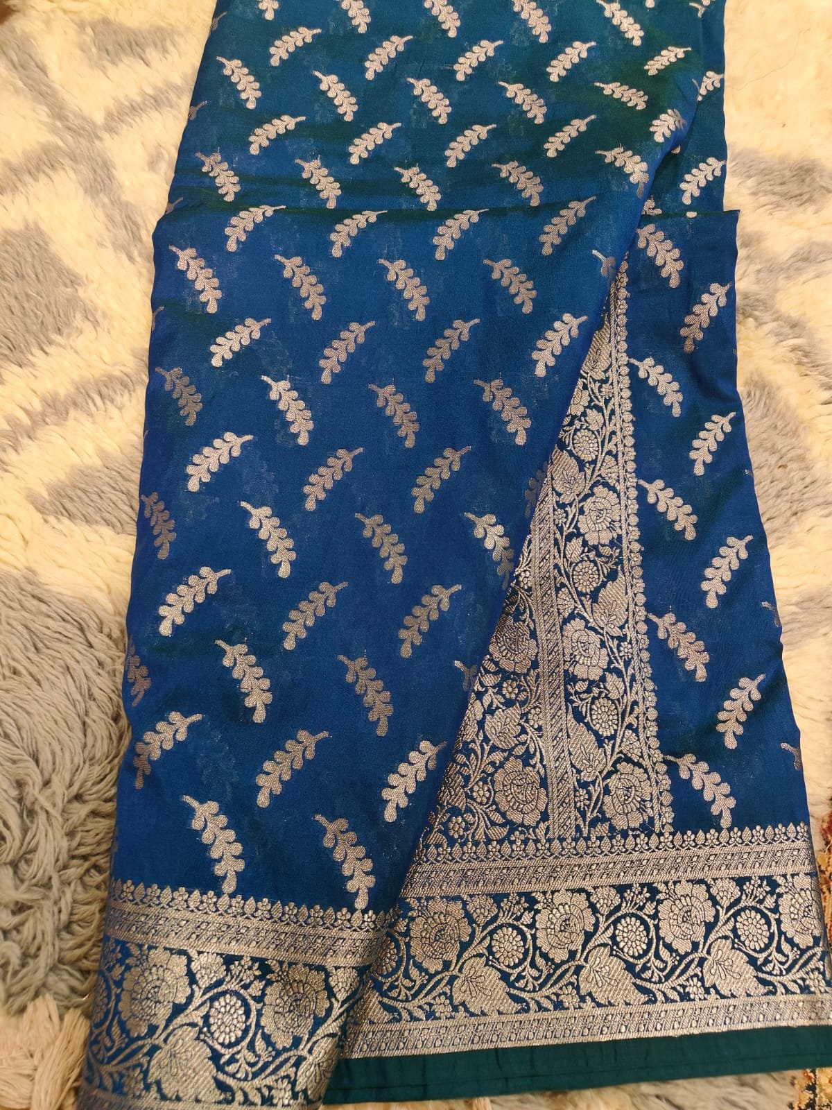 Be the first to review “Blue banarasi silk saree with silver zari long booti pattern.silver zari blouse.”