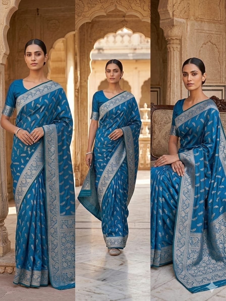 Perfect for summer functions. A Banarasi silk saree with a classic booti jal pattern showcases timeless elegance and rich craftsmanship. The delicate all-over woven motifs create a graceful and luxurious look. Made from fine silk fabric, it offers a smooth drape and traditional charm, making it perfect for weddings, festive occasions, and cultural celebrations. ✨