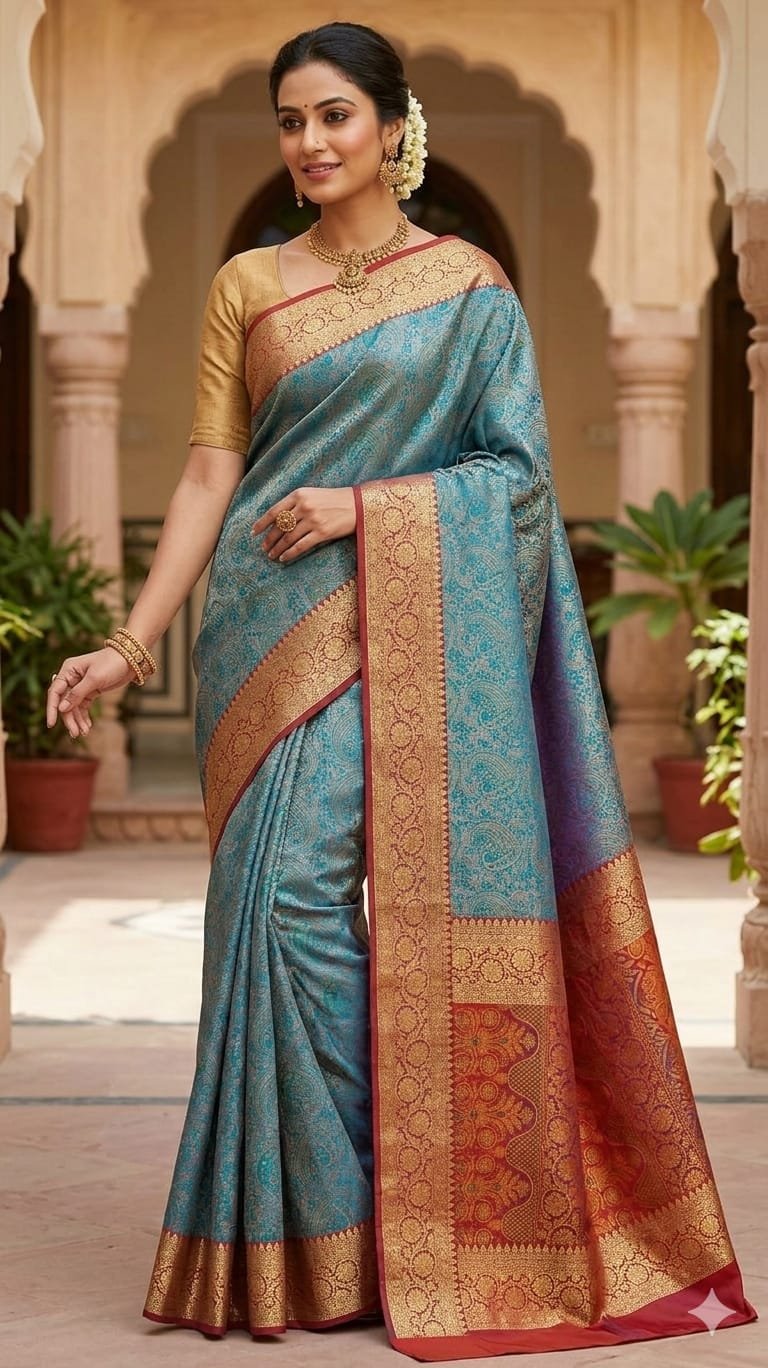 Banarasi looms present the most luxurious saree. Perfect for summer functions. A Banarasi silk saree with a classic booti jal pattern showcases timeless elegance and rich craftsmanship. The delicate all-over woven motifs create a graceful and luxurious look. Made from fine silk fabric, it offers a smooth drape and traditional charm, making it perfect for weddings, festive occasions, and cultural celebrations. ✨