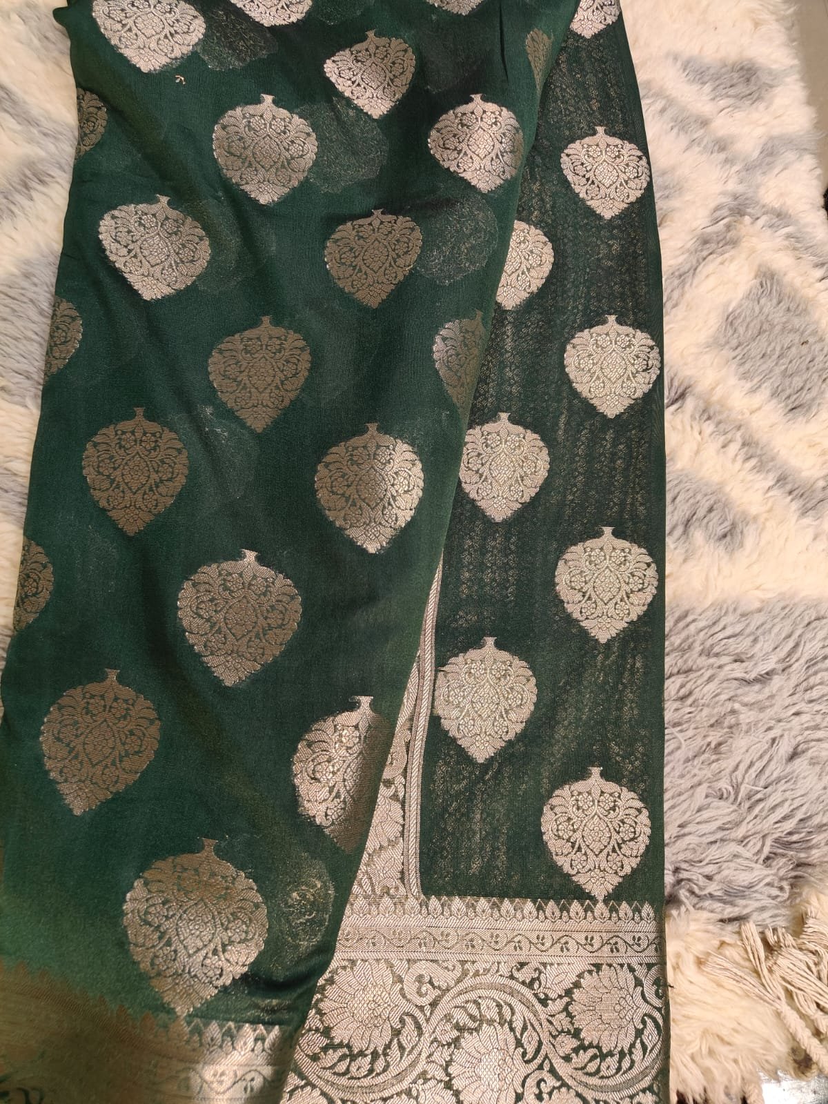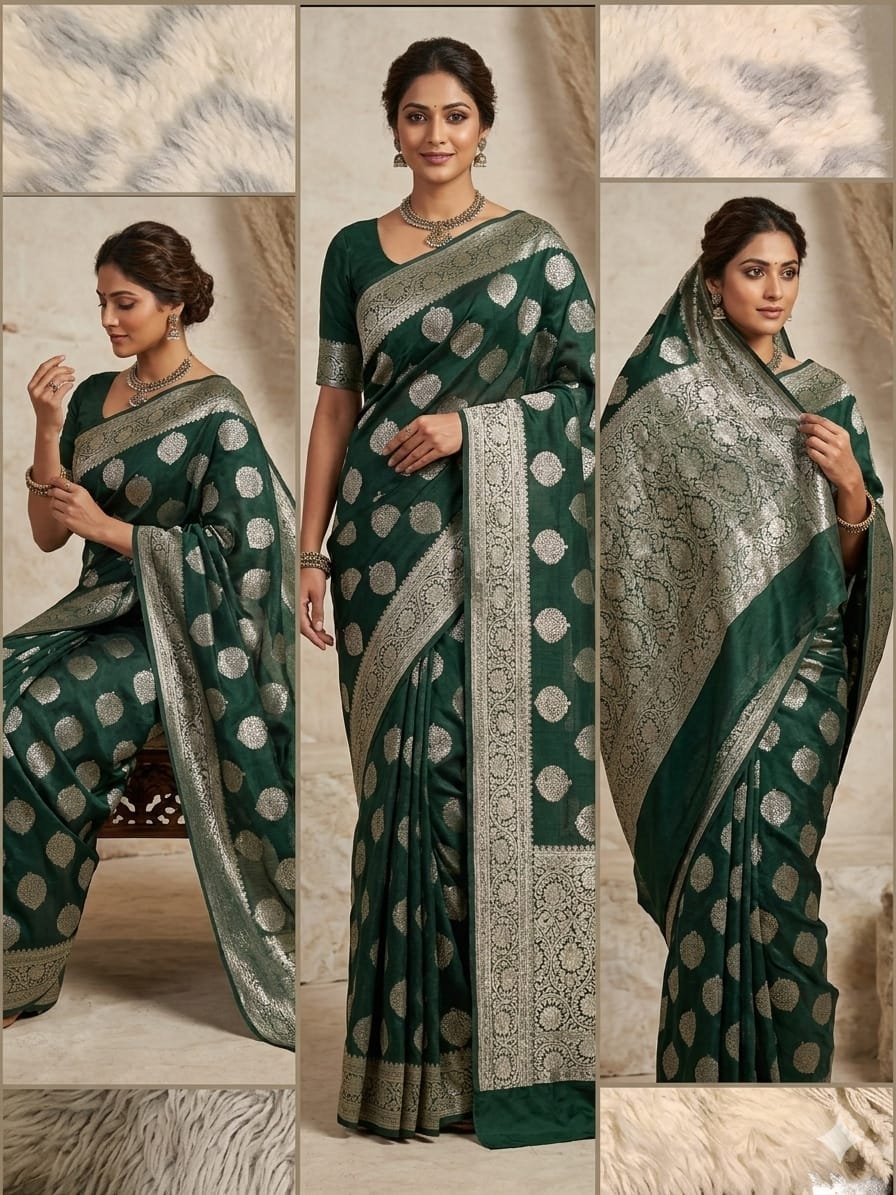 A Banarasi silk saree with a classic booti jal pattern showcases timeless elegance and rich craftsmanship. The delicate all-over woven motifs create a graceful and luxurious look. Made from fine silk fabric, it offers a smooth drape and traditional charm, making it perfect for weddings, festive occasions, and cultural celebrations. ✨