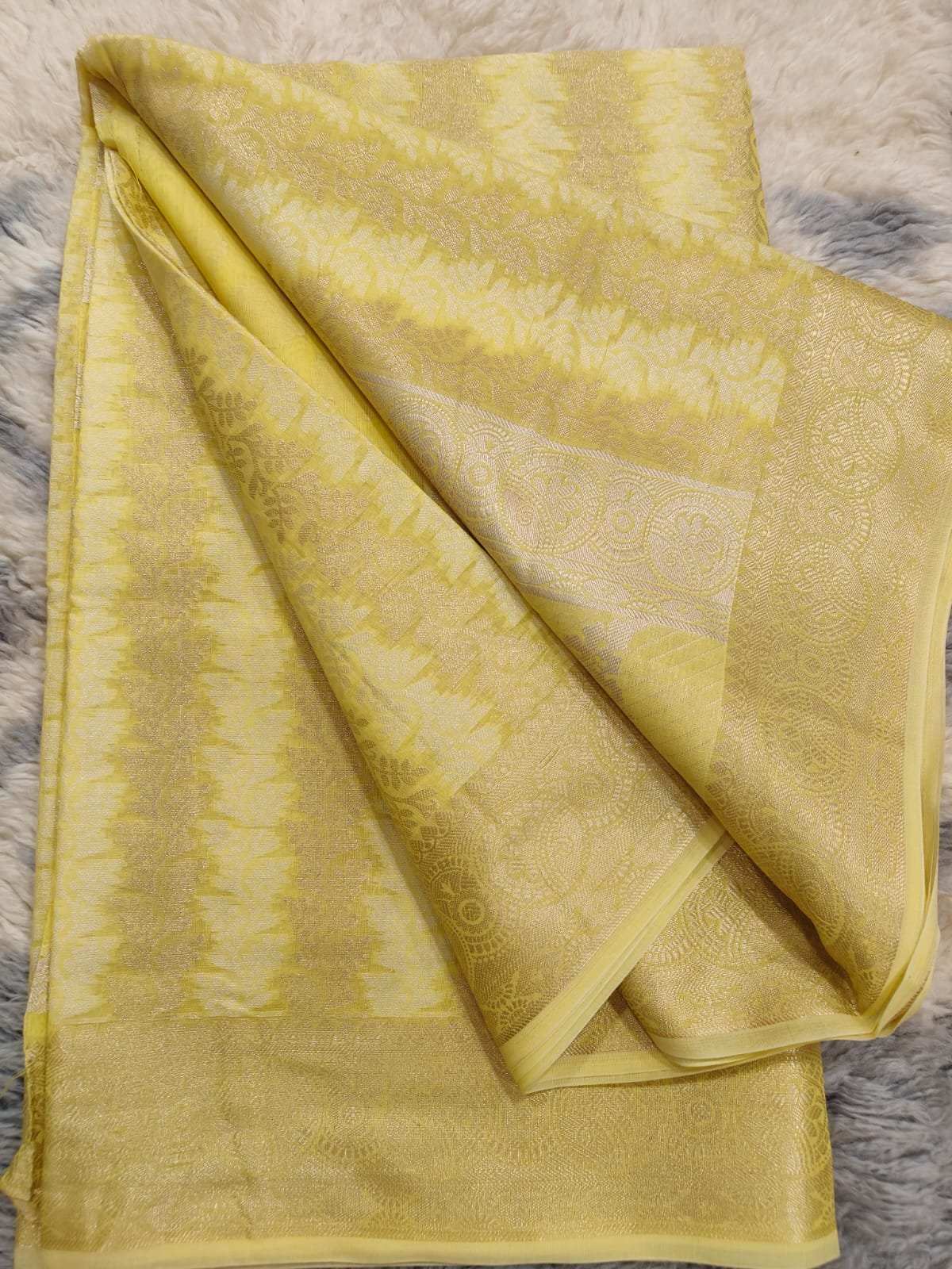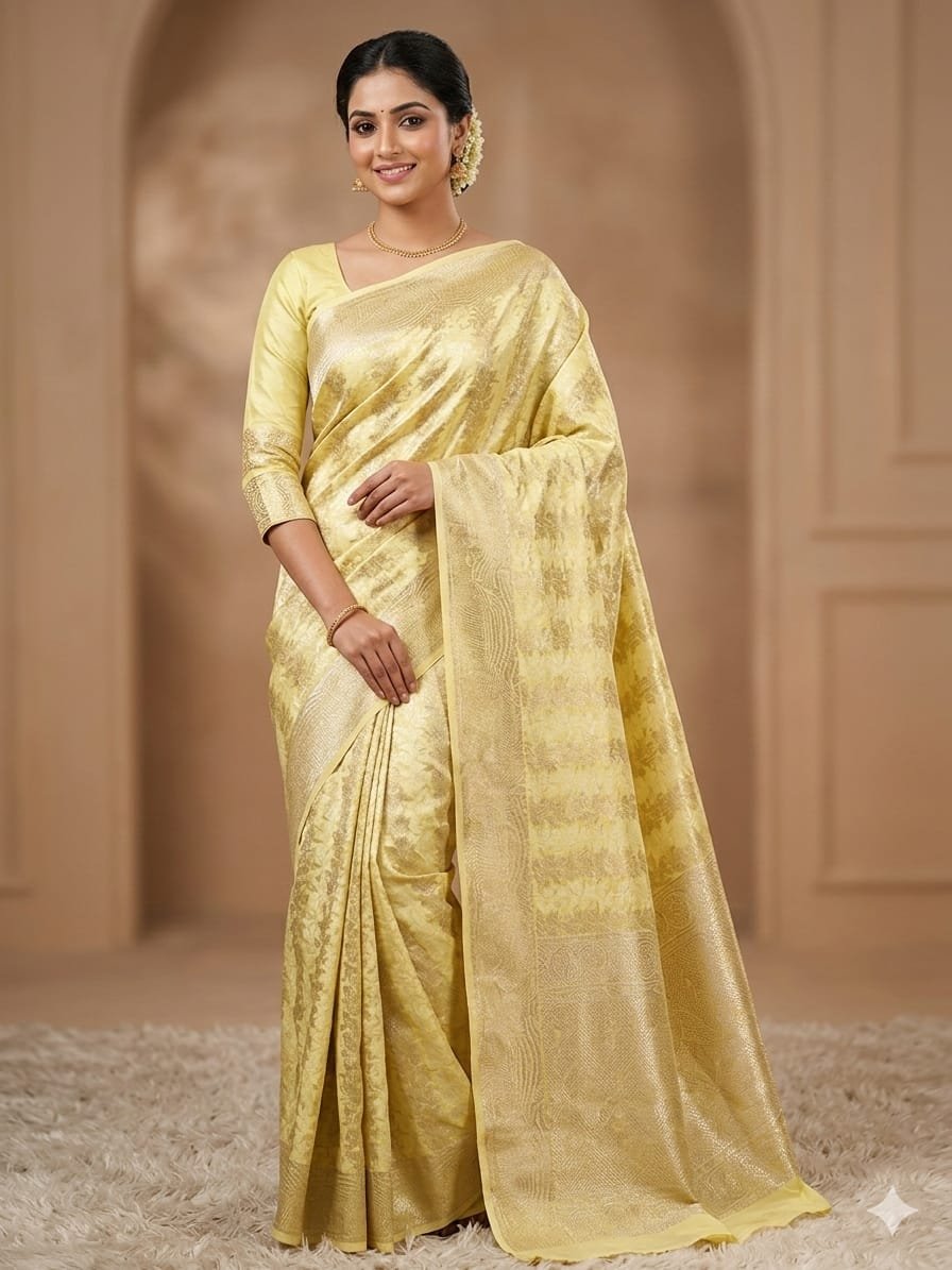 Be the first to review “Golden yellow chanderi silk banarasi saree with overall zari thread weaving”