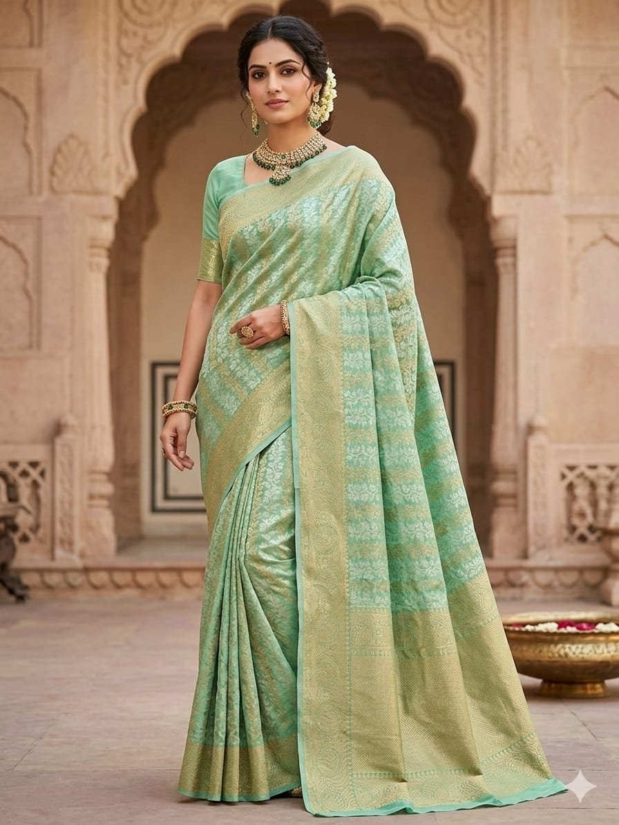 A golden pink Banarasi Chanderi saree with overall zari and thread work reflects elegance and traditional charm. Crafted from lightweight Chanderi fabric, it features delicate zari weaving and fine thread designs across the saree. Perfect for festive occasions and celebrations, it offers a graceful drape, subtle shine, and timeless ethnic beauty. ✨