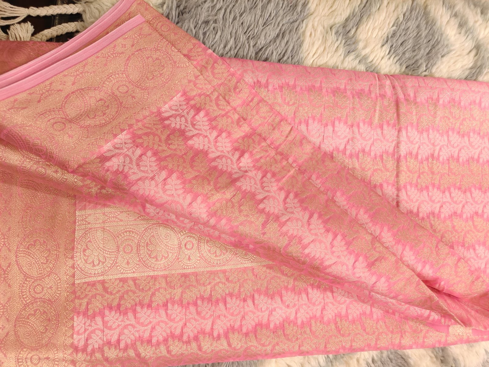 Be the first to review “Golden pink banarasi chanderi saree with overall zari and thread work.”