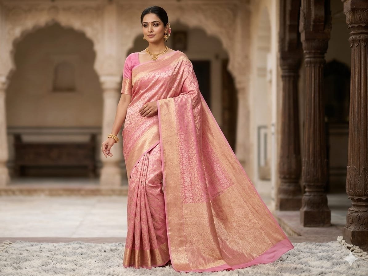 A golden pink Banarasi Chanderi saree with overall zari and thread work reflects elegance and traditional charm. Crafted from lightweight Chanderi fabric, it features delicate zari weaving and fine thread designs across the saree. Perfect for festive occasions and celebrations, it offers a graceful drape, subtle shine, and timeless ethnic beauty. ✨