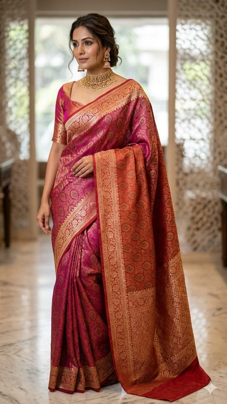 Banarasi looms present the most luxurious saree. Perfect for summer functions. A Banarasi silk saree with a classic booti jal pattern showcases timeless elegance and rich craftsmanship. The delicate all-over woven motifs create a graceful and luxurious look. Made from fine silk fabric, it offers a smooth drape and traditional charm, making it perfect for weddings, festive occasions, and cultural celebrations. ✨
