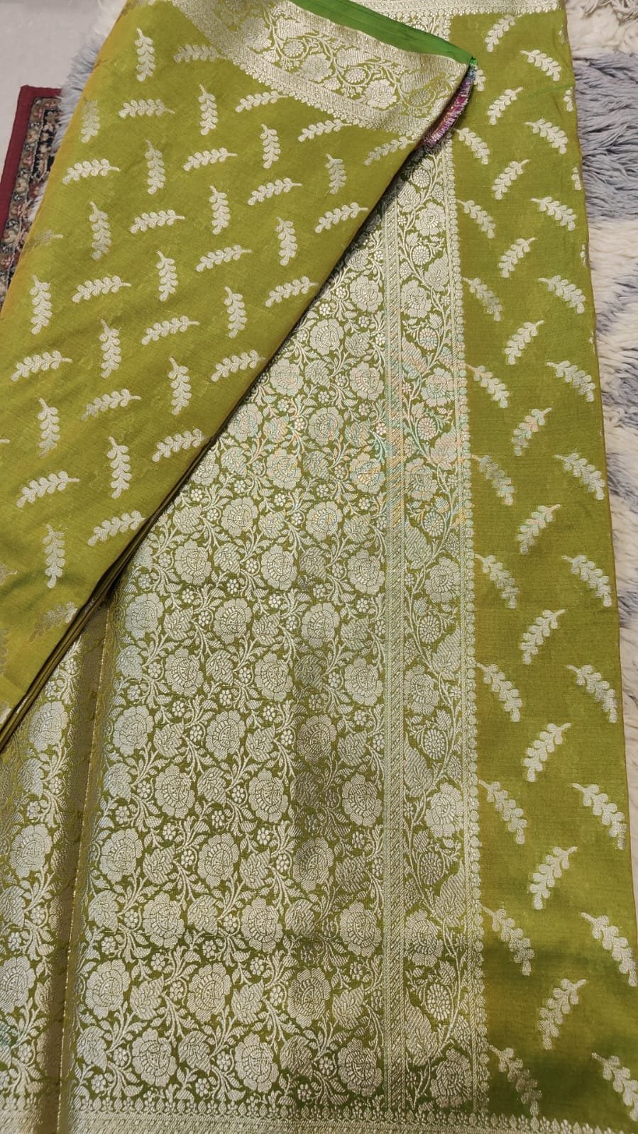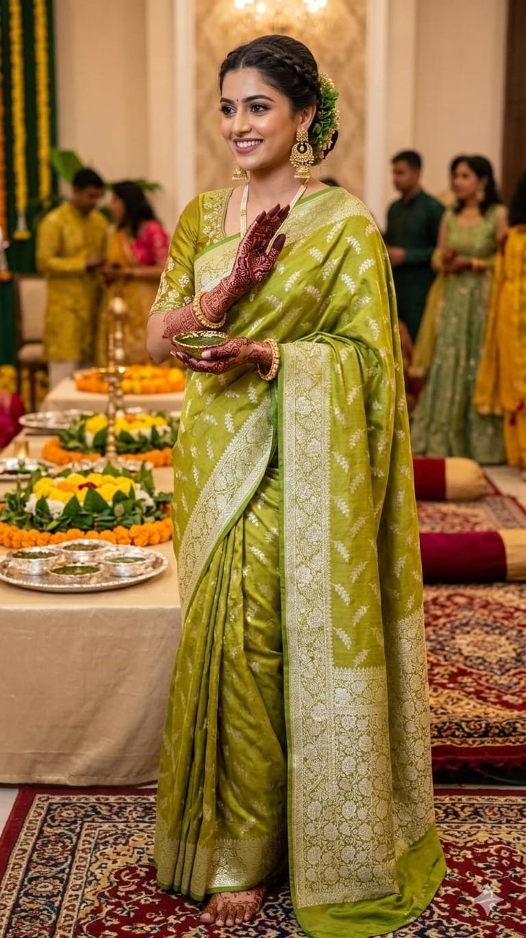 Be the first to review “Mehdi colour double shade banarasi saree with golden zari long booti pattern.perfect for mehdi ceremony.”